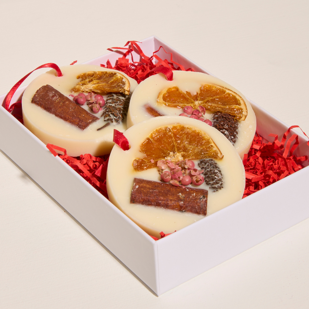 Christmas Time is a fresh happy scent bursting with juicy orange and spicy notes of cinnamon and clove. Hang from your tree to add extra seasonal scent to the room!